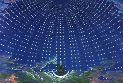 Eine Andeutung dieser Situation gibt das Bühnenbild Friedrich Schinkels zur Zauberflöte. Da steht die Königin der Nacht ganz klein, ganz unten auf der liegenden Mondsichel wie in einem Boot. Über ihr aber und um sie herum ist die ganze Bühne ein einziger riesiger dunkelblauer Himmel, besetzt mit unzähligen glänzenden Sternen.