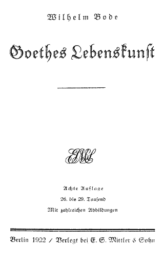 Vorwort zur sechsten AuflageVielleicht hätte ich ein Buch, das bereits in 14 000 Abzügen verbreitet und überall freundlich aufgenommen wurde, nicht so stark umgestalten sollen, wie bei dieser neuen Ausgabe geschehen. Aber da ich mich beständig mit Goethes Leben, Werken und Umwelt beschäftige, so kann es nicht ausbleiben, daß meine Kenntnisse zunehmen, meine Auffassungen sich ändern, manche neue Erklärungen sich ergeben und manche Zusammenhänge deutlich werden, die ich früher nicht sah. Als ich vor vierzehn und dreizehn Jahren dies Buch schrieb, hieß die Aufgabe, die ich mir gewählt hatte: 'Goethe als Mensch'. Mit diesem Titel sandte ich die Handschrift an "E. S. Mittler & Sohn", d. h. an Dr. Theodor Toeche-Mittler, der jetzt nach einer sehr fruchtbaren Tätigkeit dem im gleichen Sinne wirkenden Sohne zusieht. Dieser ältere Freund nahm als ein aufrichtigster Verehrer unseres Dichters an meinen ersten Arbeiten auf diesem Gebiete einen herzlichen Anteil und fügte deshalb seinem bereits sehr ausgebreiteten Verlagshause noch ein Angebäude für Goethe-Bücher hinzu. Das neue Buch, meinte er damals, müsse in 'Goethes Lebenskunst' umgetauft werden. Ich fügte mich, und der Erfolg hat ihm recht gegeben, denn Niemand hat den Titel beanstandet, und einige Beurteiler haben ihn ausdrücklich als zutreffend gelobt. (Nur Signild Wejdling, die eine schwedische Übersetzung herausgab, hat, ohne von mir zu wissen, die ursprüngliche Überschrift vorgezogen: 'Goethe såsom Människa'.) So hat also der Verfasser des Buches dem Namengeber zu danken; aber der Leser soll doch wissen, wie die Aufgabe eigentlich gestellt war und daß nicht etwa die Absicht einer Goethe-Verherrlichung zu Grunde lag oder liegt. Es soll durchaus nicht Alles, was hier mitgeteilt wird, als klug und weise gelten; sehr oft tritt eben nur "Goethe als Mensch" vor uns. "Wie lange wird es dauern", sage er 1809 zu Falk, "so werden sie auch an mich glauben und mir Dieses und Jenes nachsprechen. Ich wollte aber, sie behaupteten ihr Recht und öffneten ihre Augen selbst." Weimar, Neujahr 1913. Zur achten Auflage.Ein Münchener Nervenarzt schrieb mir einmal, er verordne dies Buch seinen Patienten. Ich weiß nicht, welche Erfolge er damit hat, und wünsche mir mehr gesunde Leser als krankhaft erregte. Aber wahr ist es, daß dies Buch ein ruhiges und beruhigendes ist. Das fällt mir selbst auf, weil ich die neue Auflage in den unruhigsten Zeitläuften, die wir je erlebt haben, abschließe. Weimar, Herbst 1921. Dr. Wilhelm Bode. |