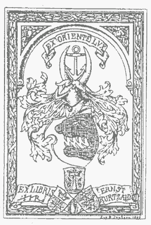 "Ex Libris" von Ernst Kurtzahn mit dem Familienwappen, welches lt. Siebmachers Wappenbuch 1916 zur Wappenrolle des 'Herold' angemeldet wurde. Gustav Meyrink dem Dichter des "Golem" gewidmet |