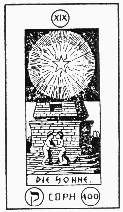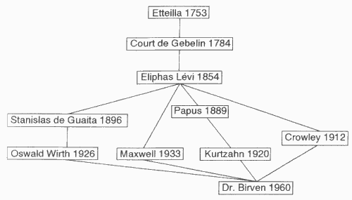 Filiation der Tarot-Überlieferung p. 206 Etteilla (Pseud.) = Jean-François Alliette, *1738, +12.12.1791 Paris; der "Vater" des esoterischen Tarot; weitere Daten zur Person sind unbekannt, außer daß Eliphas Lévi ihn einen "ehemaligen Barbier" nennt. Zum anderen hat Lévi selbst gesehen, daß auf der 28. Tarotkarte vermerkt war: "Etteilla, professeur d'algèbre, rénovatur de la cartomancie ...", und wissen müßte, daß E. der Autor von mindestens 25 Büchern war. E. hatte sich seit 1753 mit den Geheimnissen der Tarotkarten befaßt u. seine eigenwillige Deutung in fast einem Dutzend Büchern publiziert. p. 364 Kurtzahn-Tarot. Bis zum Ende des 1. Weltkriegs gab es praktisch keine deutsche Tarot-Literatur, wenn man einmal von der schon damals selten gewordenen Ausgabe bei Scheible ("Buch Thot", Stuttgart 1857) absieht. Der Esoteriker Dr. Hummel (bekannt unter dem Pseudonym Laarss) hatte aber schon Material und namentlich französische Tarot-Literatur gesammelt, um selbst ein Tarot-Buch zu schreiben. Indes stellte Dr. Hummel das Material dann dem Esoteriker Kurtzahn zur Verfügung, woraus nicht nur das erste deutsche Tarot-Buch entstand, sondern auch der Kurtzahn-Tarot. Immer auf die Quellen zurückgehend, basierte Kurtzahn die Deutung der Kartenbilder seines Tarot ("Tarut-Daïtyanus") auf Etteilla, wie sie im "Buch Thot" bei Scheible beschrieben war. Die Karten sind im Buch von Kurtzahn abgedruckt und waren auch im Format 7 x 12 cm beim Talis-Verlag in Leipzig erhältlich. Diese Kurtzahn-Tarotkarten unterscheiden sich vom alten Marseiller Tarot und jenem von Oswald Wirth hauptsächlich dadurch, daß den 22 Hauptkarten ("Die großen Arkana") noch die entsprechenden hebräischen Buchstaben und deren Aussprache und Zahlenwerte hinzugefügt wurden. Kurtzahns Tarot-Buch bietet die ausführlichste Beschreibung und esoterische Deutung des Tarot, darunter allein 10 verschiedene Formen, die Karten sinnvoll aufzulegen. |
