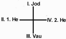 Liest man die hebräischen Buchstaben in der Reihenfolge 1- 4: Jod - He - Vau - He, so erhält man den unaussprechlichen göttlichen Namen "jehovah", um den sich in letzter Linie die ganze Kabbala und natürlich auch der Tarot, der ja Kabbala ist, dreht, wie wir bei der Besprechung eben dieses Namens demnächst sehen werden. Die vier Figurenkarten heißen für alle Gruppen: