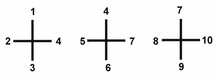 Zeichnerisch ergibt sich folgende Figur (1). ![]() Fig. 1: Darstellung einer Gruppe der kleinen Arkana. Die Figuren haben dieselben Beziehungen zu den Gruppen wie die Zahlen zu den Figuren: |