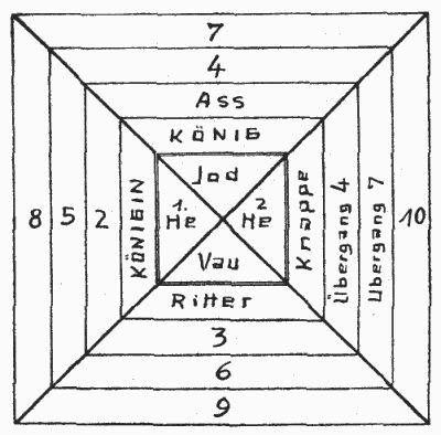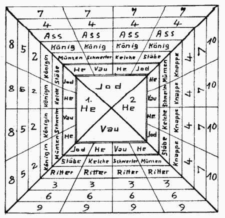 Auch diese Untergruppe entspricht wieder dem heiligen Namen: ![]() Vielleicht macht eine zeichnerische Wiedergabe des Prinzips des heiligen Namens, das im ganzen Tarot andauernd zur Anwendung kommt, den Gegenstand noch verständlicher: ![]() wofür man selbstverständlich die Bezeichnungen Szepter, Kelche, Schwerter und Pentakel, König, Königin, Ritter und Knappe setzen kann. Auch die 10 Zahlenkarten jeder Gruppe unterliegen diesem Gesetz, sie sind einfach numeriert: eins, zwei, drei, vier, fünf, sechs, sieben, acht, neun und zehn und entsprechen in ihren "Sequenzen" ebenfalls nach obigem Schema dem göttlichen Namen: ![]() |