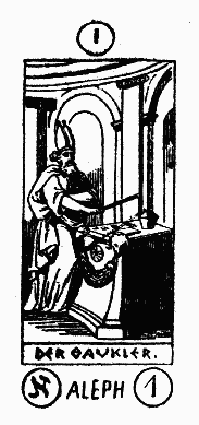Der der ersten Karte, dem Gaukler, entsprechende hebräische Buchstabe Aleph Bei vielen Tarotsystemen bemüht sich die auf der ersten Karte dargestellte Figur des Gauklers, die Haltung des Buchstaben Aleph anzunehmen, und zwar dadurch, daß die eine Hand nach oben und die andere nach unten zeigt (diese Darstellung erübrigt sich aber in dem Falle, wenn die Tarotkarten, wie sie es eigentlich alle sollten, aber viele leider nicht tun, die hebräischen Schriftzeichen klar und deutlich aufweisen; bei den diesem Buch beigegebenen Karten ist peinlich darauf geachtet). Diese Haltung soll eine uralte, schon in der sogenannten "Tabula Smaragdina Hermetica" (der smaragdenen Tafel des Hermes Trismegistos, eines berühmten ägyptischen Priesters und Eingeweihten), mit den Worten: Den Boden des Bildes bildet die Erde. Die priesterliche Kopfbedeckung deutet das göttliche Zeichen des universellen Lebens an, während die Mitte der Karte von der Figur selbst eingenommen wird. Diese steht vor einem Altar, auf dem sich drei große Symbole des Tarots befinden, nämlich: Die beiden Arme des Gauklers symbolisieren die beiden großen polaren Prinzipien des großen Alls, nämlich das aktive göttliche, |