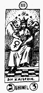 gehaltenen Schilde, dem Planetenzeichen Venus, versinnbildlicht wird. Die Karte verkörpert also die Idee der Zeugung und der "Fleischwerdung des Wortes" in allen Welten. Die weibliche Gestalt der Kaiserin ist von vorn gesehen abgebildet, das menschliche Wesen entsteht im im Schoße der Frau. Ihre Darstellung mit Flügeln entspricht der Idee der Geistigkeit des lebenden Grundgedankens, Prinzips allen Seins. Ein symbolisches Szepter hält sie in ihrer linken Hand, um die passive Rolle des Weibes in der Natur kennzeichnen. Die drei Zacken der Krone und die das Haupt umgebenden neun Sterne versinnbildfichen, als zusammen die Zwölfzahl ergebend, die zwölf Tierkreisbilder. Ferner zeigt diese Karte das Ergebnis der Wechselwirkung der beiden ersten Karten, die einander so in einem Grundgedanken neutralisieren, denn die absolute schöpferische Kraft des Osiris und die (absolute) erhaltende Kraft der Isis neutralisieren sich in der ausgleichenden Kraft, die in sich selbst die zwei sehr verschiedenen Eigenschaften der beiden erstgenannten Formen enthält.