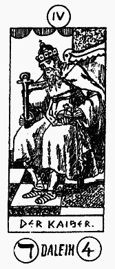 Nach unserem alten Schlüssel Jod-He-Vau-He wird die nun folgende vierte Karte dem zweiten He des heiligen Namens entsprechen und wieder einen Übergang von einer Serie zu einer neuen andeuten. 4. Tarotkarte: "Der Kaiser", (4. Buchstabe