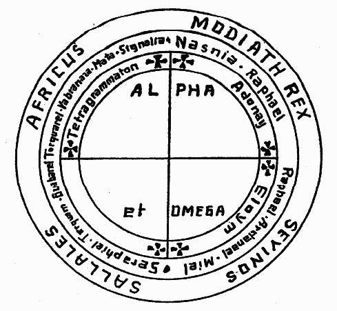 Außerdem nehme man ein Pentagramm (fünfstrahligen Stern) mit hinein. Den Tisch setze man in den Kreis, sich selbst auch, aber so, daß man in der Mitte auf einem Stuhl sitzt oder auch nur steht. |