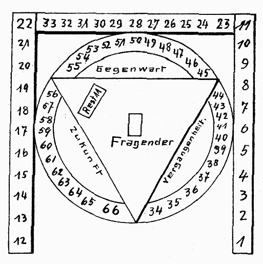 Bei arabisch 1 beginnt die Deutung, die arabische 2 zeigt die näheren Umstände an, arabische 3 etwaige Hindernisse, arabische 4 das Ende der Angelegenheit. Das große Arkanum I zeigt die in der Vergangenheit geherrscht habenden Einflüsse, II die der Gegenwart, III endlich die Einflüsse der Zukunft. |