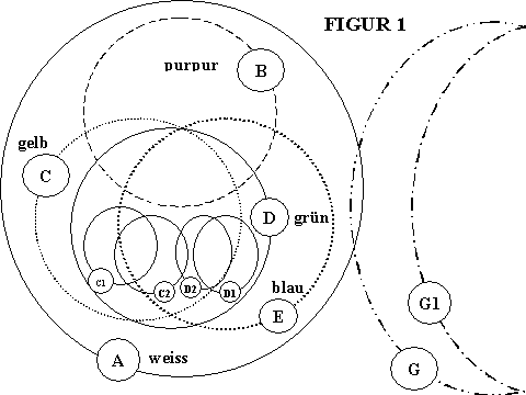 Erkenntnis der menschlichen ErkenntnisDie Grenzen der menschlichen Erkenntnisfähigkeit werden neu und weiter gezogen als bisher, womit auch Mathematik und Logik sowie Wissenschaft und Kunst neue Grundlagen erhalten; die bisherige erkenntnistheoretische Bemühung um Auffindung einer Grundstruktur von Begriffen für ein adäquates wissenschaftliches Denken (Denkkategorien) und einer entsprechenden Logik und Mathematik wird als legitim anerkannt. Die Mängel in den bisherigen Erkenntnistheorien, formalen und inhaltlich bestimmten Logiken und der Mathematik werden aufgezeigt. Gliederung, Struktur der menschlichen Erkenntnisoperationen![]() Die folgenden Ausführungen werden sicher manchem Leser ungewohnt erscheinen. Mögen sie wenigstens dazu beitragen, ihm sichtbar zu machen, um welche Probleme es eigentlich geht, wenn man beginnt, die Erkenntnis des menschlichen Erkenntnisvermögens und der Erkenntnisoperationen zu untersuchen. Es handelt sich um kondensierte Überlegungen, die aus den erkenntnistheoretischen Werken Krauses (15, 17, 19, 20, 22, 29a, 33, 36, 37, 38, 44) zusammengestellt wurden. Wir benutzen die Figur 1. Ein Mensch erkennt die Welt außer sich, Natur G (Landschaft, Bäume usw.) und die Gesellschaft G(1) um sich, also z. B. seine Familie, die deutsche Sprache, die Zeilen, die er hier liest. Eine Außenwelt, Natur G und eine Gesellschaft G(1), erkennen wir nicht unmittelbar. Zugänglich sind uns von ihr nur Zustände unserer Sinnesorgane des Körpers E (blau), die wir hereinnehmen in die Phantasie D (grün). Wir benutzen die nachbildende äußere Phantasie D(1) und die schöpferische innere Phantasie D(2) und Begriffe C (gelb), die wir teilweise bereits bei der Geburt in unserem "Bewusstsein" besitzen und die wir als C(1) bezeichnen, teils aus dem Gesellschaftssystem G(1) übernehmen, in welches wir hineingeboren werden und die wir als C(2) bezeichnen. Hieraus bilden, konstruieren und konstituieren wir eine in der Person, im Subjekt, in uns bestehende (subjektimmanente) Erkenntnis der "Außenwelt". Für jeden Ungewohnten erscheint es ein wenig kühn, wenn er hört: "Ich weiß gar nicht, wie die 'Außenwelt' aussieht, denn das, was ich von ihr weiß, ist nichts als ein Bild, ein Konstrukt, das ich mir davon mache. Ich sehe nur, was in meinen Augennerven ist, aber nicht die Abendsonne, die ein Blatt durchleuchtet." Nur das Angewirktsein der Sinne durch die "Außenwelt" kommt von außen, alle übrigen Tätigkeiten sind aktive, erzeugende Handlungen im Bewusstsein des Menschen. Die genaue Unterscheidung von D(1) und D(2) ist dabei ebenso wichtig wie die Unterscheidung der Begriffe, die schon bei Geburt gegeben sind, von jenen, die über die Gesellschaft und deren Sprache im Rahmen der Sozialisation erworben werden. Da jeder in einer sozialen Umwelt geboren wird, die durch die Faktoren der Gesellschaft (wie z. B. Sprache, Kultur, Wirtschaft, Politik, Schichtung) bestimmt ist, tritt eine Wirkung aller dieser Faktoren auf E, D und C ein, die zu einer Kanalisierung und Regulierung, entsprechend den Färbungen der Gesellschaft, führt. Die Probleme der Erkenntnis der Außenwelt über die Sinne wollen wir jetzt ausführlicher behandeln, wobei die heute teilweise ungebräuchliche Ausdrucksweise der erkenntnistheoretischen Schriften Krauses beibehalten wird. Auffallend ist, dass auch in der derzeitigen Erkenntnistheorie die für die Erzeugung der Erkenntnis einer Außenwelt wichtigen Funktionen der Phantasietätigkeit wenig beachtet werden. Erkenntnis von AußenweltÄußerlich sinnliche Erkenntnis mittels E, D(1), D(2), CFür die Kenntnis der Welt um uns brauchen wir einen Leib. Der Zustand der Sinnesorgane, also der "Stempel", den das Außen auf ihnen erzeugt, ist alles, was von außen ist. Ein Blinder erhält auf der Netzhaut keine "Spuren". Er lebt daher in einer "anderen" Welt. Von diesen Zuständen in den Sinnen behaupten wir, sie seien Wirkungen äußerer, "wirklicher" Gegenstände, die in Raum und Zeit sind, die mit unserem Leib, also mit Augen, Nase, Ohren, Haut usw., in einer Wechselwirkung stehen, wobei aber diese Sinnesorgane bei der Erzeugung dieser Empfindungen selbst auch aktiv mitwirken. Wir behaupten dann auch gleich - eigentlich sehr kühn -, dass einerseits diese Gegenstände auch unabhängig davon, dass sie in unseren Sinnen Wirkungen erzeugen, existieren und dass sie andererseits, unabhängig von unserer Sinnlichkeit, unserer Fähigkeit und Möglichkeit, sie wahrzunehmen, gegeben sind. Allgemeine Bedingungen für die Sinneswahrnehmung sind: